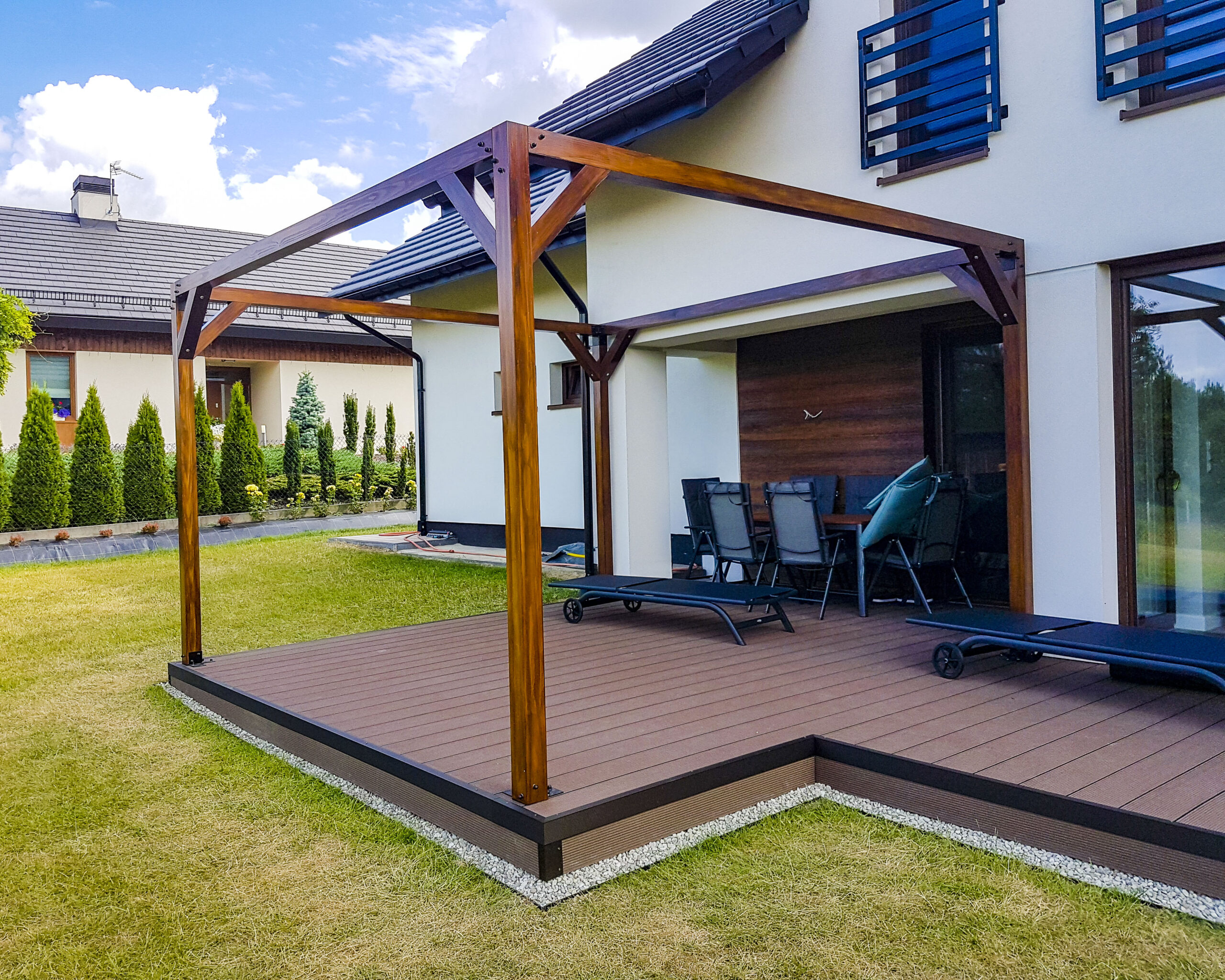 Nasza praca z drewnem nie zaczęła się we wnętrzach. Już wiele lat temu realizowaliśmy konstrukcje zewnętrzne, takie jak wiaty, altany czy elementy placów zabaw. Były to projekty wymagające solidnych rozwiązań konstrukcyjnych, odporności na warunki atmosferyczne oraz precyzyjnego doboru materiałów.
